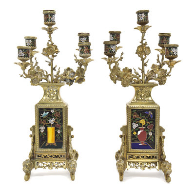 A Pair of Continental Gilt Bronze and Champleve Five-Light Candelabra,