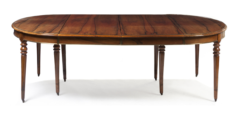 the oval top over the brass banded frieze raised on turned tapering legs ending in casters, having six leaves.