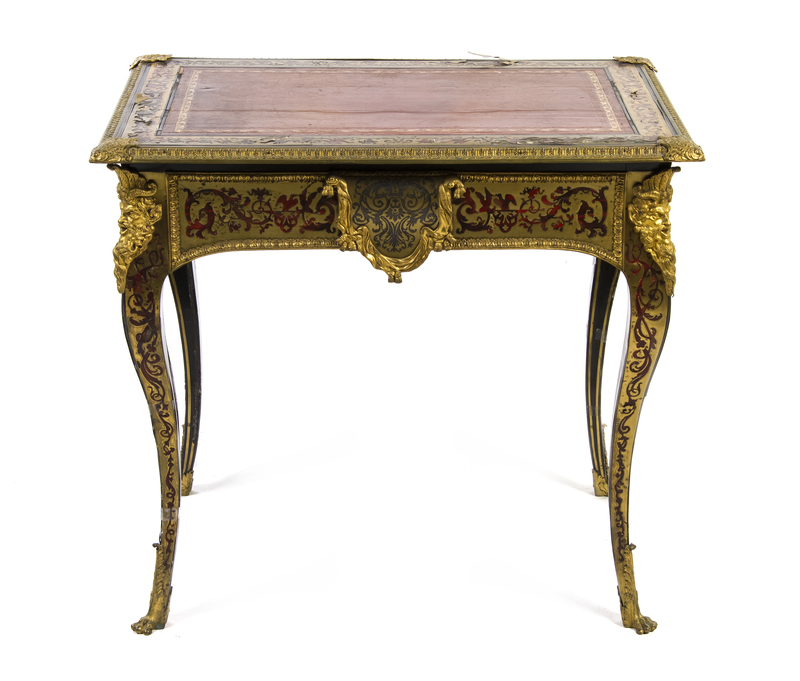 having a rectangular tooled leather inset top over a single drawer, the frieze set with satyr and male mask mounts, raised on cabriole legs ending in sabots.