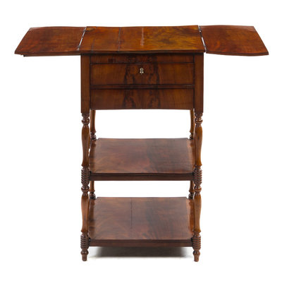 19th century, having a square top with two rectangular drop-down leaves over two short drawers, raised on baluster turned supports joined by two shelves.