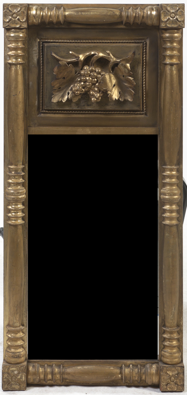 having a vertical rectangular plate under a panel with carved grape cluster and leaf decoration, the whole within half round engaged turned columns with rosettes at the corners.