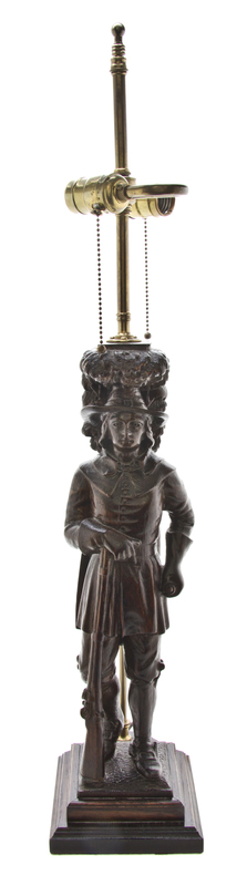 depicting a pilgrim gentleman leaning on his rifle, raised on a naturalistic base, mounted as a lamp.