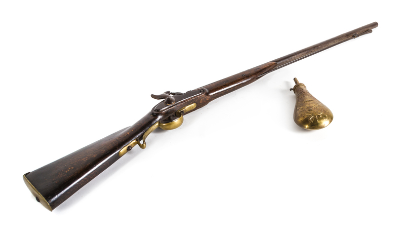 having a walnut stock and iron barrel, the brass trigger guard stamped 8D274, together with a brass powder flask.