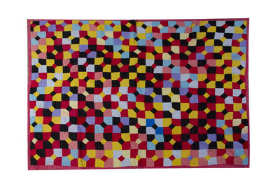 20th century, worked throughout with black, yellow, red, blue, violet and pink variations within a pink border.
