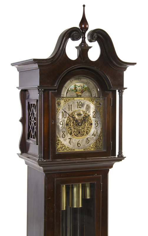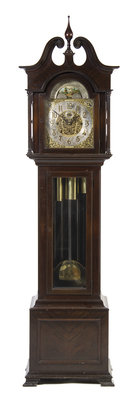 having a broken arch pediment centered with a finial over the brass face with a steel chapter ring having Arabic hours, further set with a moon phase and seconds dial and foliate spandrels, the German time and strike movement sounding on tubes, set on a straight glazed trunk raised on bracket feet.