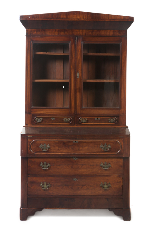 in two parts, the superstructure with a peaked cornice above two glazed doors opening to shelves above drawers, the base having a leather lined writing slope above four drawers, raised on bracket feet.