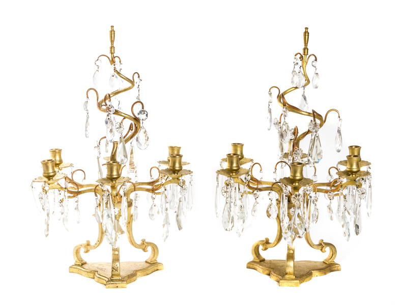 each issuing shaped candle arms with floriform candle cups, hung with prisms throughout.