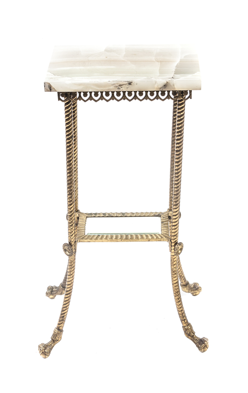 having a rectangular top raised on twist supports joined by a beveled glass medial shelf, raised on slightly splayed claw and ball feet.