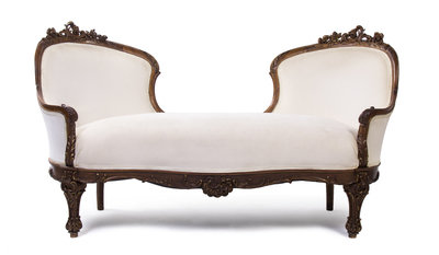 having a pierce carved Rococo crest over the upholstered back and seat, raised on tapering legs.