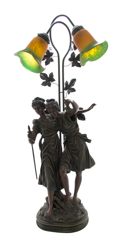 in the form of two maidens frolicking, raised on a circular naturalistic base, set with two bell form glass shades with ivy leaf decoration throughout.