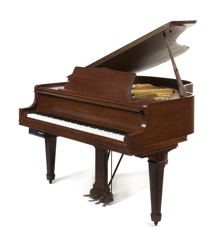 1973, serial number 182128, set in a mahogany case, raised on square tapering legs with a later electronic playing mechanism and an associated bench.