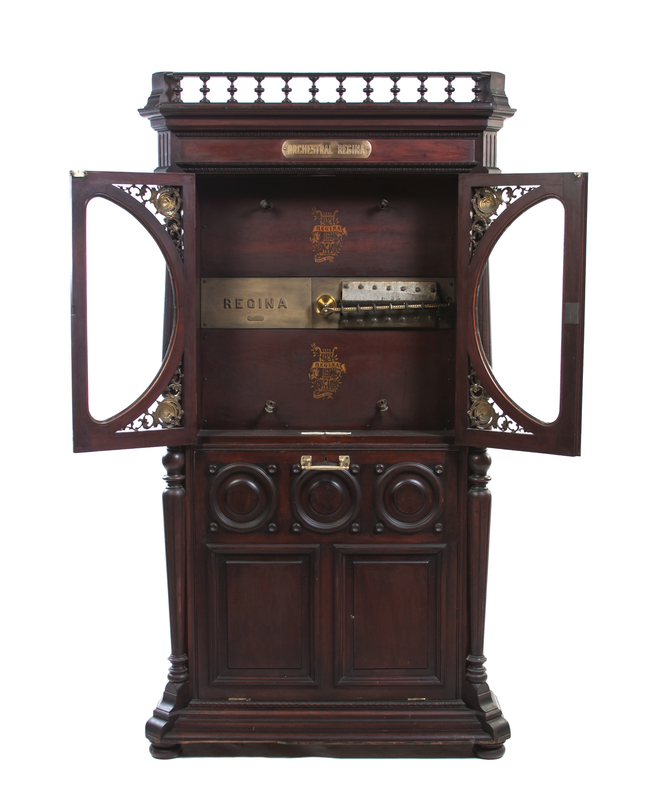 model 5, playing 27 inch discs on two combs, the mahogany case with a galleried crest over two glazed doors above a paneled door, raised on flattened ball feet.To view working condition of music box:VideoVideo