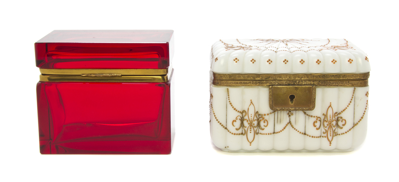 comprising a gilt metal mounted cranberry glass example and a gilt metal mounted opaline glass example painted with arabesques.