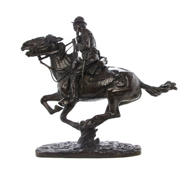 Trooper of the Plains, depicting a soldier astride a galloping stallion, raised on a naturalistic base, signed copyright Frederic Remington, marked 8 and stamped Roman Bronze Works, N.Y.