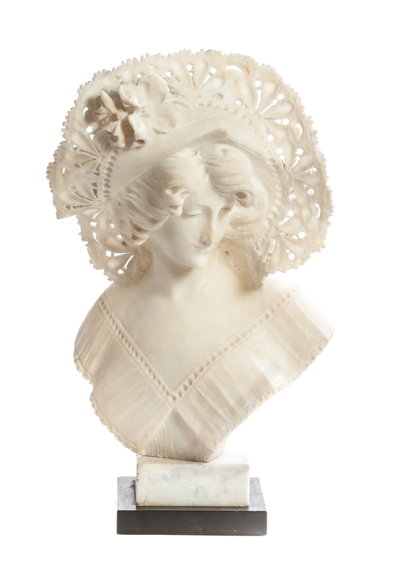 depicting a lady in a Victorian style bonnet, raised on a two-tone marble stepped plinth base.