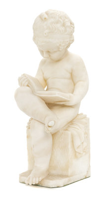 19th/20th century, depicting a classical boy with a headband sitting on a pedestal reading.