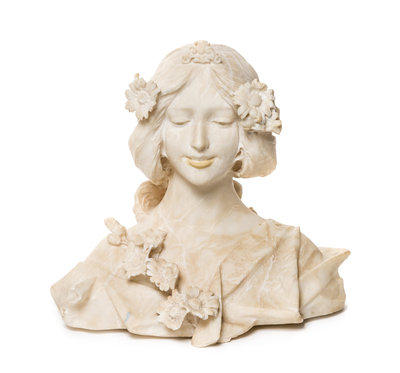 late 19th/early 20th century, depicting a maiden with flowers in her hair and on her blouse.