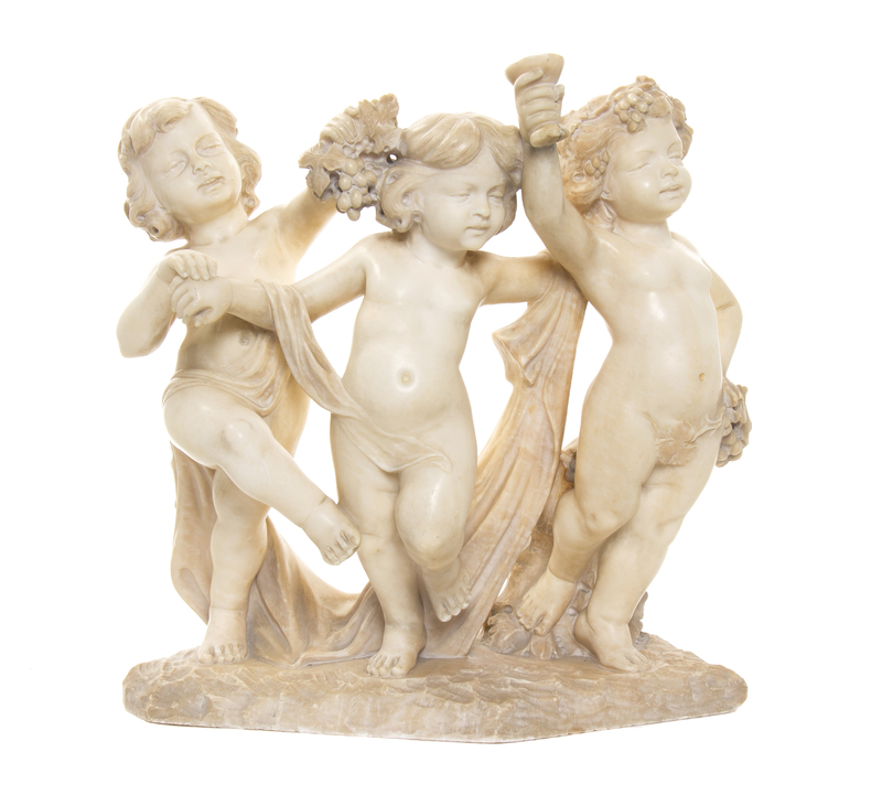 depicting three youthful Bacchic figures, one with a raised goblet, another with grapes, raised on an oval naturalistic base.
