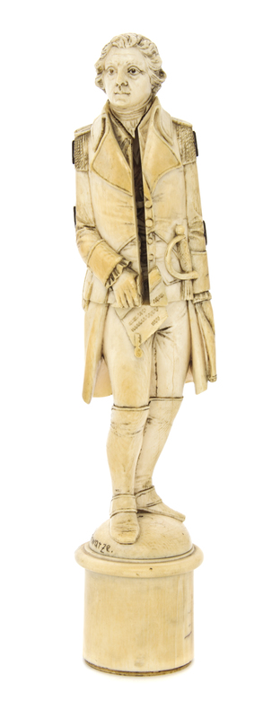 19th century, depicting a general, possibly General Horatio Gates, his chest opening to reveal a triptych of the surrender after the Battle of Saratoga in 1777, the base signed H. Schwarze.