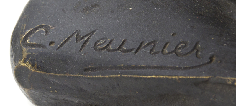 Le Debardeur, depicting a standing dock worker in contrapposto with his hands on his hips, signed C. Meunier.