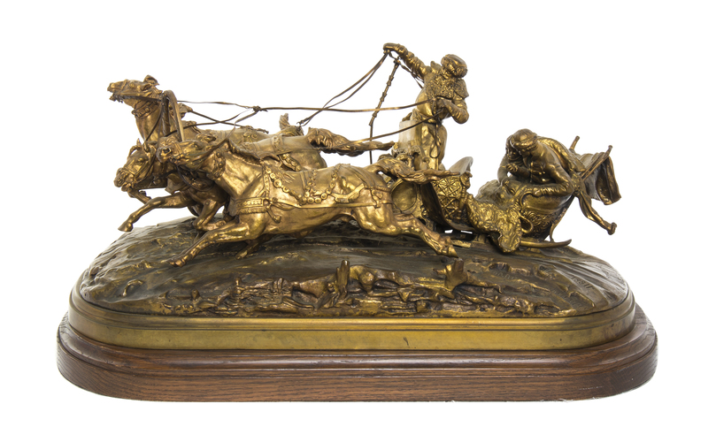 A Pleasure Ride in a Winter Troika, depicting three horses pulling a sleigh with an izvozchik and two passengers, having a mold incised artist signature and Chopin foundry mark, each in Cyrillic, further dated 1881.