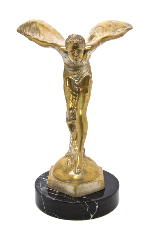 Spirit of Ecstasy, set on a hexagonal fixed base, further mounted on a black marble disk.