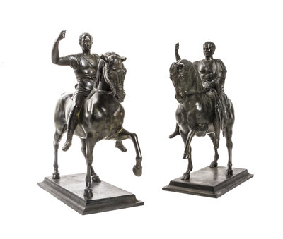 A Pair of Grand Tour Style Bronze Equestrian Groups, after the Antique,