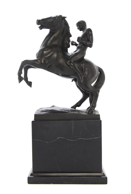 depicting a man on a rearing stallion, raised on a marble plinth base.