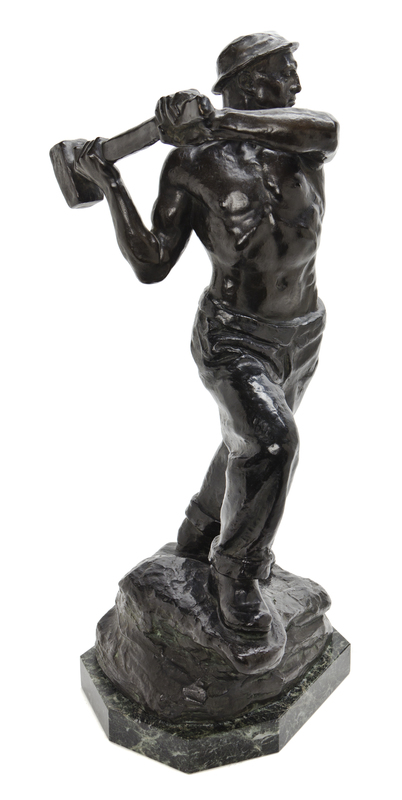 Stempelsetzer, depicting a timber man with his hammer raised, standing in a stepping position on rockery, signed P. Vogelsanger and raised on a marble base.