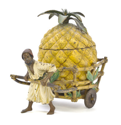 depicting an Arab pulling a cart carrying a large pineapple form box with a hinged lid.