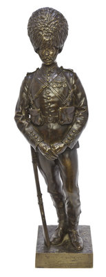 Grenadier Guard 1889, depicting the standing soldier in full uniform with rifle and packs, raised on a square base, titled to front, signed G.E. Wade Sculp, further with H. Luppens & Cie foundry mark.