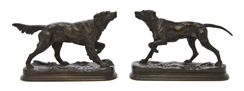 each depicting a hunting dog in pointing pose, raised on a naturalistic base signed J. Moigniez.