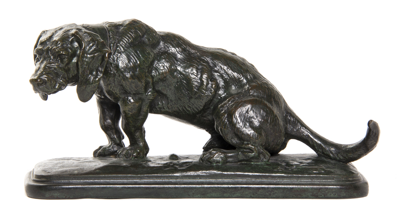 depicting a seated basset hound on a naturalistic rectangular base signed Barye, with Barbedienne F.B. foundry mark.