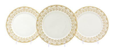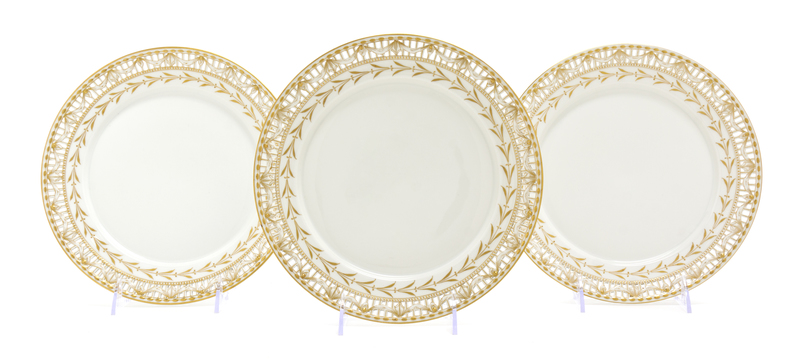 each with a reticulated rim and gilt highlights, having scepter mark in underglaze blue and orb mark in iron red.