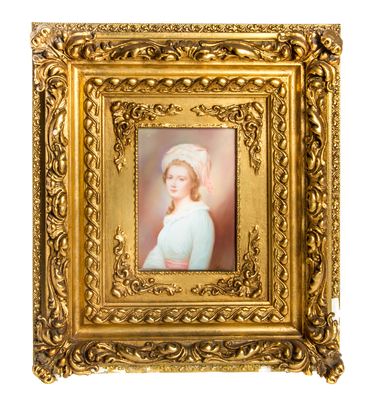 of rectangular form depicting a lady within a carved giltwood frame, the verso incised 311.