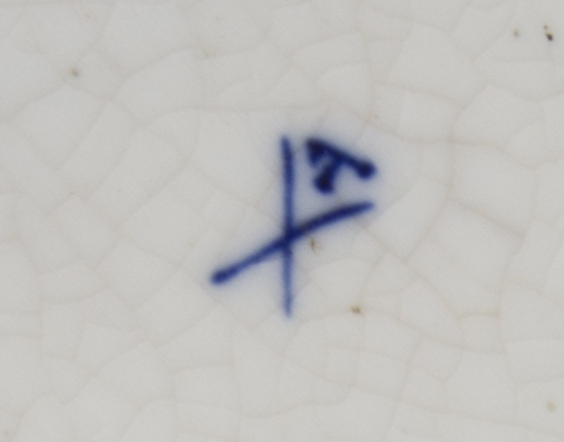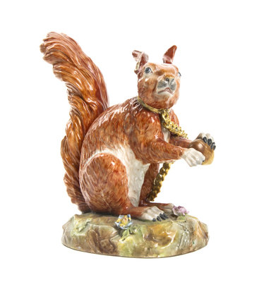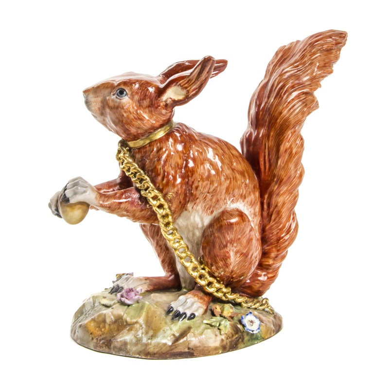 depicting a chained squirrel clutching a nut raised on an oval floral naturalistic ground, having maker's mark in underglaze blue.