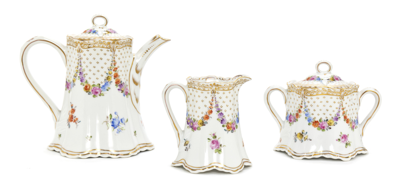 comprising a teapot, a creamer and a sugar, each of lobed cylindrical tapering form, painted throughout with floral swags, the underside with Dresden mark in underglaze blue.