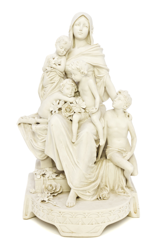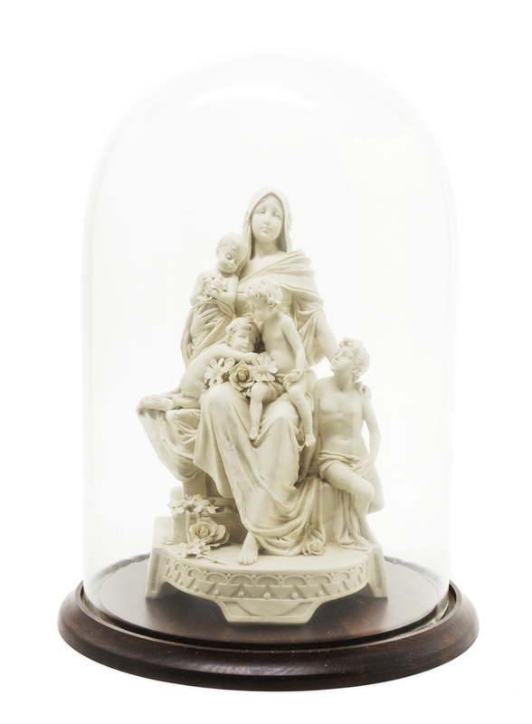 depicting a lady with four children seated on bench, having beehive mark in underglaze blue, raised on a circular wood plinth and contained in a glass dome.