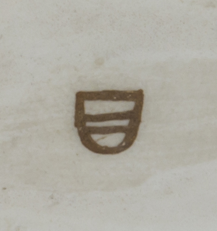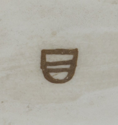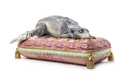 in the form of a dog relaxing on a pillow, the interior decorated with polychrome floral sprays, having shield mark in brown.