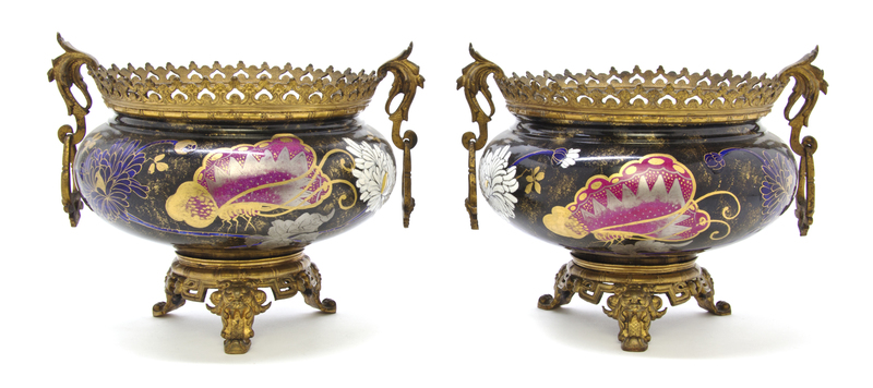 A Pair of Aesthetic Movement Gilt Metal Mounted Porcelain Urns,
