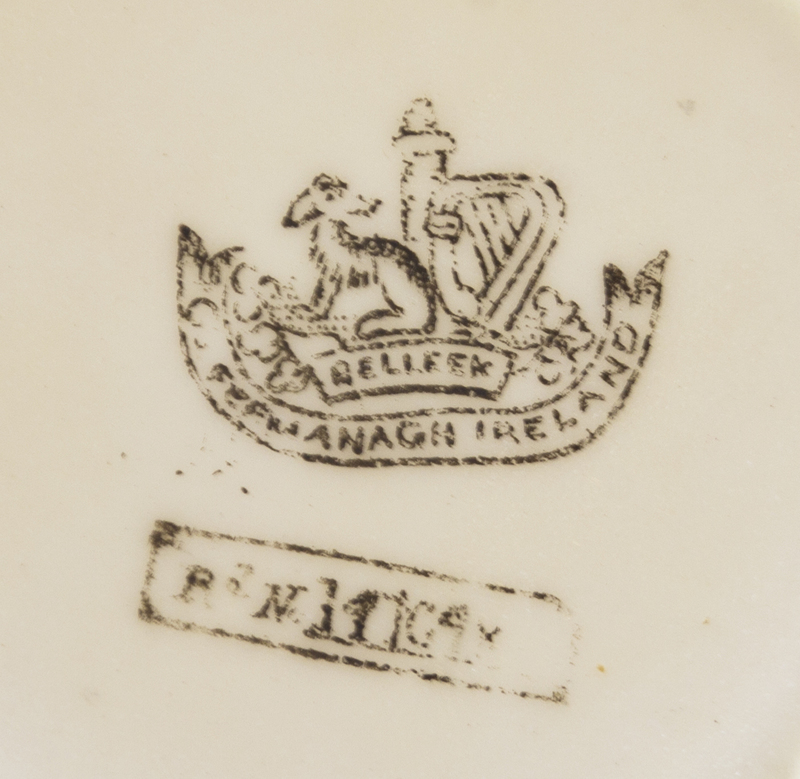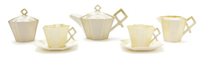 1891-1926, comprising a teapot, a creamer, a covered sugar and two teacups with saucers, each modeled in the Art Deco taste, having second Belleek black mark to base with registry mark.