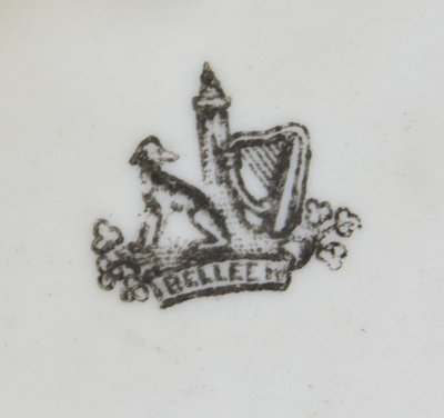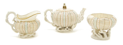 1863-1890, comprising a teapot, a creamer and an open sugar with tinted and gilt highlights and coraline bases, the creamer and sugar with first Belleek black mark, the teapot with a rubbed mark.