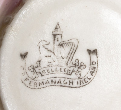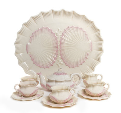 1891-1926, comprising a teapot, a creamer, an open sugar, three teacups with saucers and a tray, each having second Belleek black mark to base.