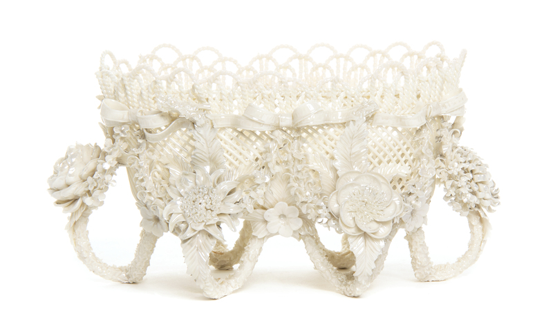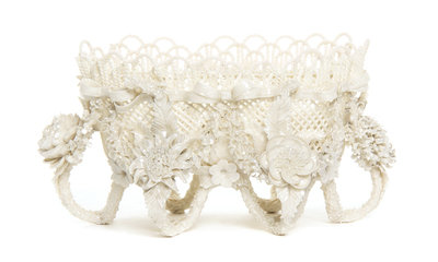 of oval form modeled with applied ribbons and floral garlands, lacking pad mark to base.