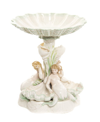 1863-1890, having a low shell form bowl over the shell and mermaid mounted tripartite base, having first Belleek black mark and English registry mark dated September 5, 1868 to base.