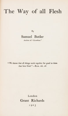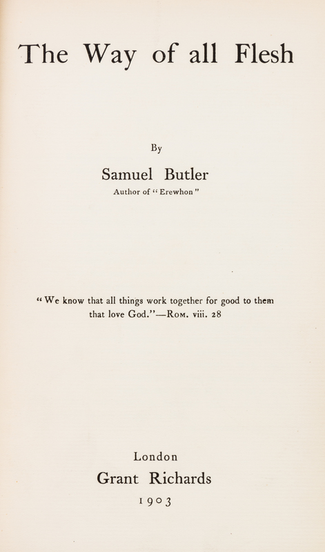 The Way of all Flesh. London: Grant Richards, 1903.8vo, publisher's gilt-lettered red cloth, red cloth slipcase. First edition with misprint on p. 352 and 12 pp. of publisher's advertisements at rear. Fading to spine; ends bumped; light soiling to slipcase; hinges starting.