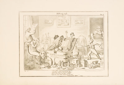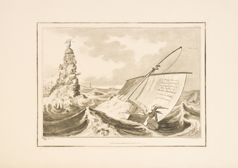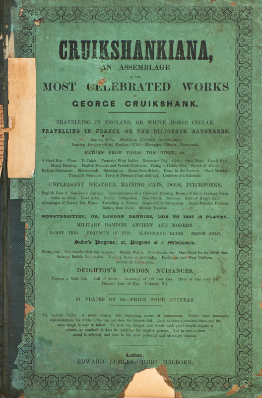 Cruikshankiana, an Assemblage of the Most Celebrated Works of George Cruikshank... London: Edward Lumley, 1835. Folio, publisher's quarter cloth over green printed wraps, printed spine label. With 27 (of 68) plates. Wear and soiling to boards; contents detached from backstrip; spine label chipped and ends frayed; 2-inch portion of upper board chipped; 2-inch brown spot to margin of first plate; offsetting from plates.