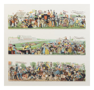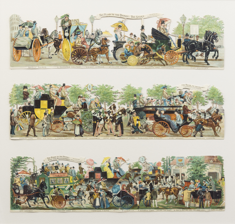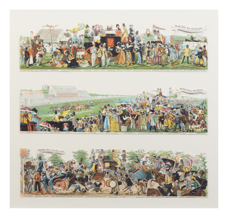 The Road to the Derby. S.l., n.d. Six raised cut-out chromolithographs by George Cruikshank depicting crowds at the horse races, in two frames.