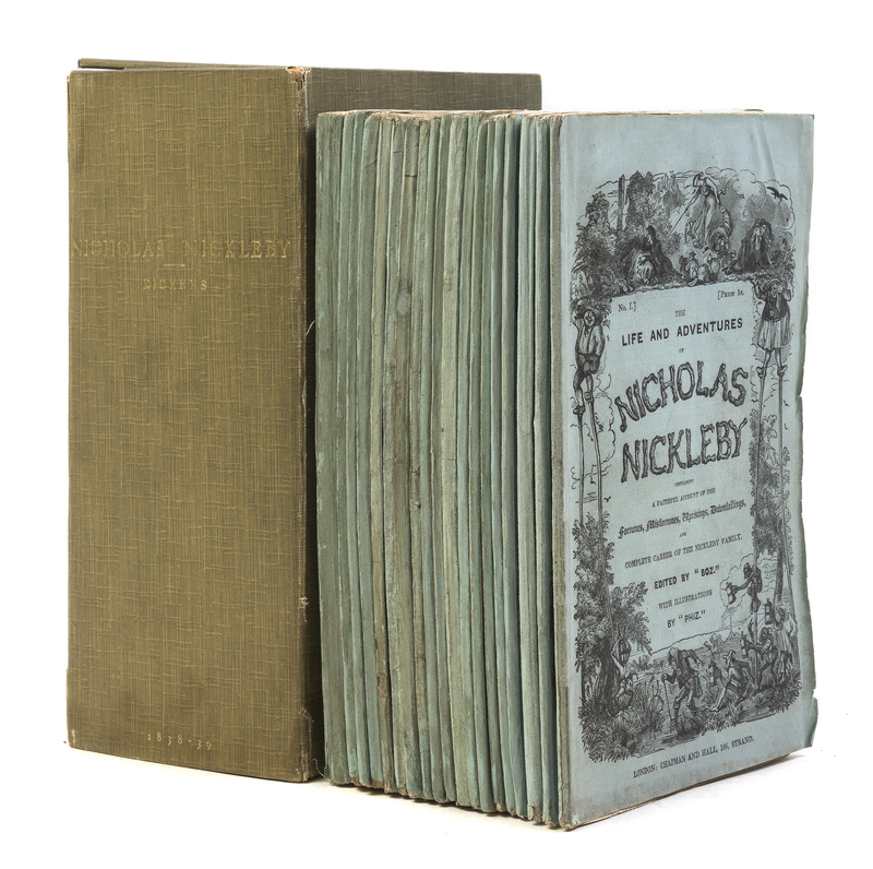 The Life and Adventures of Nicholas Nickleby. London: Chapman and Hall, April, 1838 - October, 1839. 20 parts bound in 19. 8vo, original blue-green wraps. Housed in modern green cloth-backed clamshell case, gilt-lettered spine. First edition, with "visiter" for "sister," part IV, p. 123, line 17, and "latter" for "letter," part V, six lines up, p. 160. With 40 plates by "Phiz." Fading to slipcase; light soiling and marginal chipping to wraps; scattered brownspotting; lacking 10 pages publisher's advertisements to parts III and VIII; "no plates" notice but both plates present, vol. XIV; rear wrapper for part 19/20 is for Part 15.