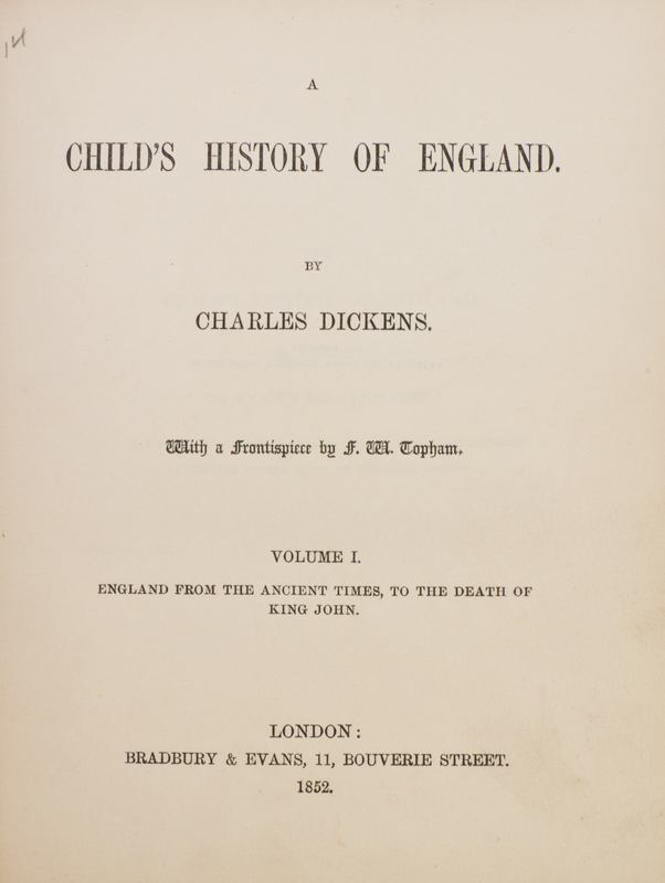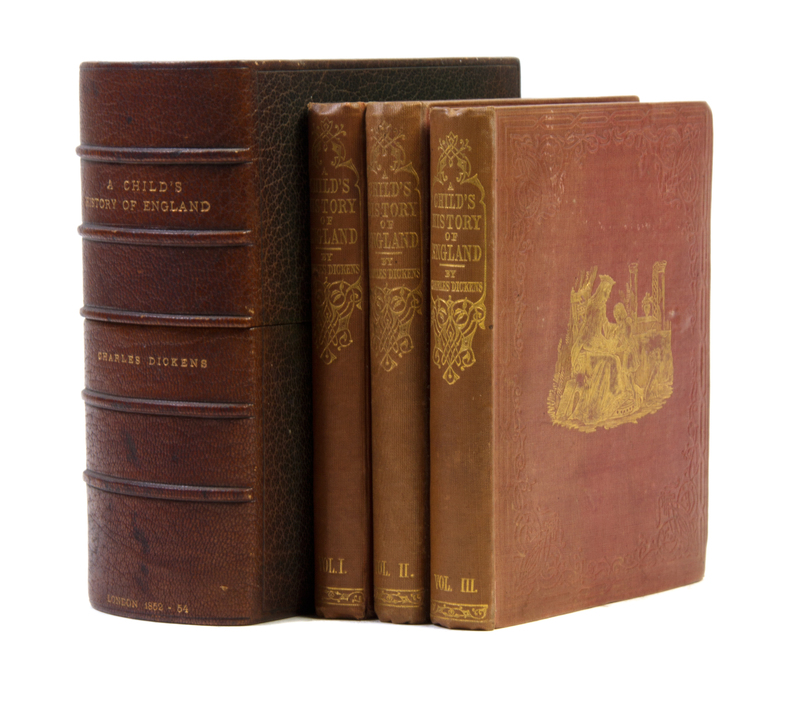 A Child's History of England. London: Bradbury and Evans, 1852-1854.3 vols. 12mo, publisher's reddish brown cloth stamped in blind with gilt-illustrated centerpiece vignettes of young Alfred reading to his mother, marbled edges and endpapers. Housed in green morocco slipcase, gilt-lettered spine. First edition, with half-titles and frontispieces. Light fading to spines; ends and corners lightly bumped; otherwise fine.